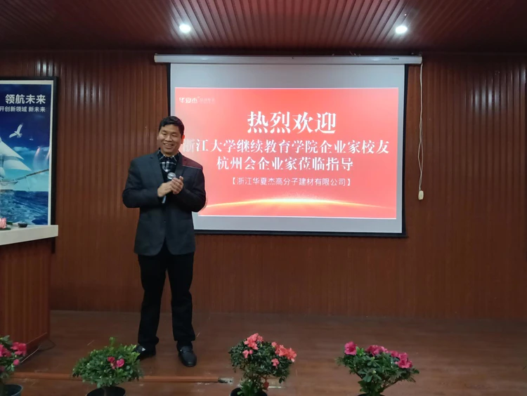 首站走访 浙江华夏杰高分子建材有限公司。董事长童明勇携团队热情接待,回顾企业自 1997 年成立以来,跨越近三十年的三大发展阶段:第一个十年:登顶 UPVC 耐老化扣板行业榜首,第二个十年:业务拓展至 36 个国家,构建国际市场版图,第三个十年:深耕国内整装领域,推出“五行木墙顶整装”创新产品。面对经济下行压力,华夏杰以敏锐的“第二曲线战略”突破传统制造瓶颈,累计取得22 项发明专利、96 项实用新型专利、3 项国际专利,荣获国家高新技术企业等多项荣誉。这一以科技创新为驱动的坚韧成长路径,赢得了校友们由衷的赞叹。